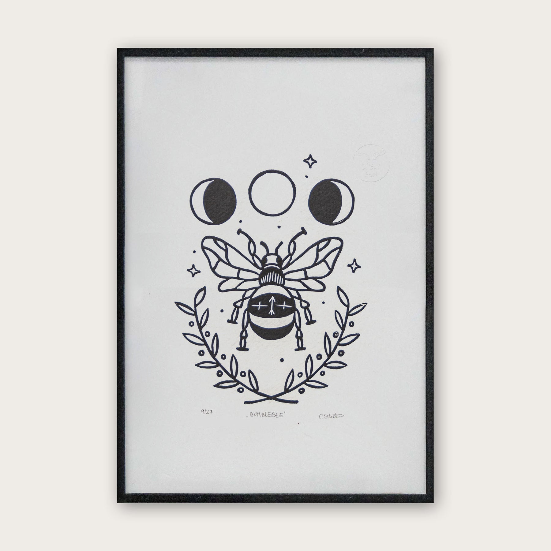 Ich drucke jeden Linoldruck händisch (mit Tinte auf Ölbasis) per Druckerpresse – somit ist jedes Exemplar ein echtes Unikat. Auf der Vorderseite findest du Nummer, Titel und meine Signatur und auf der Rückseite das Datum des Drucks.
