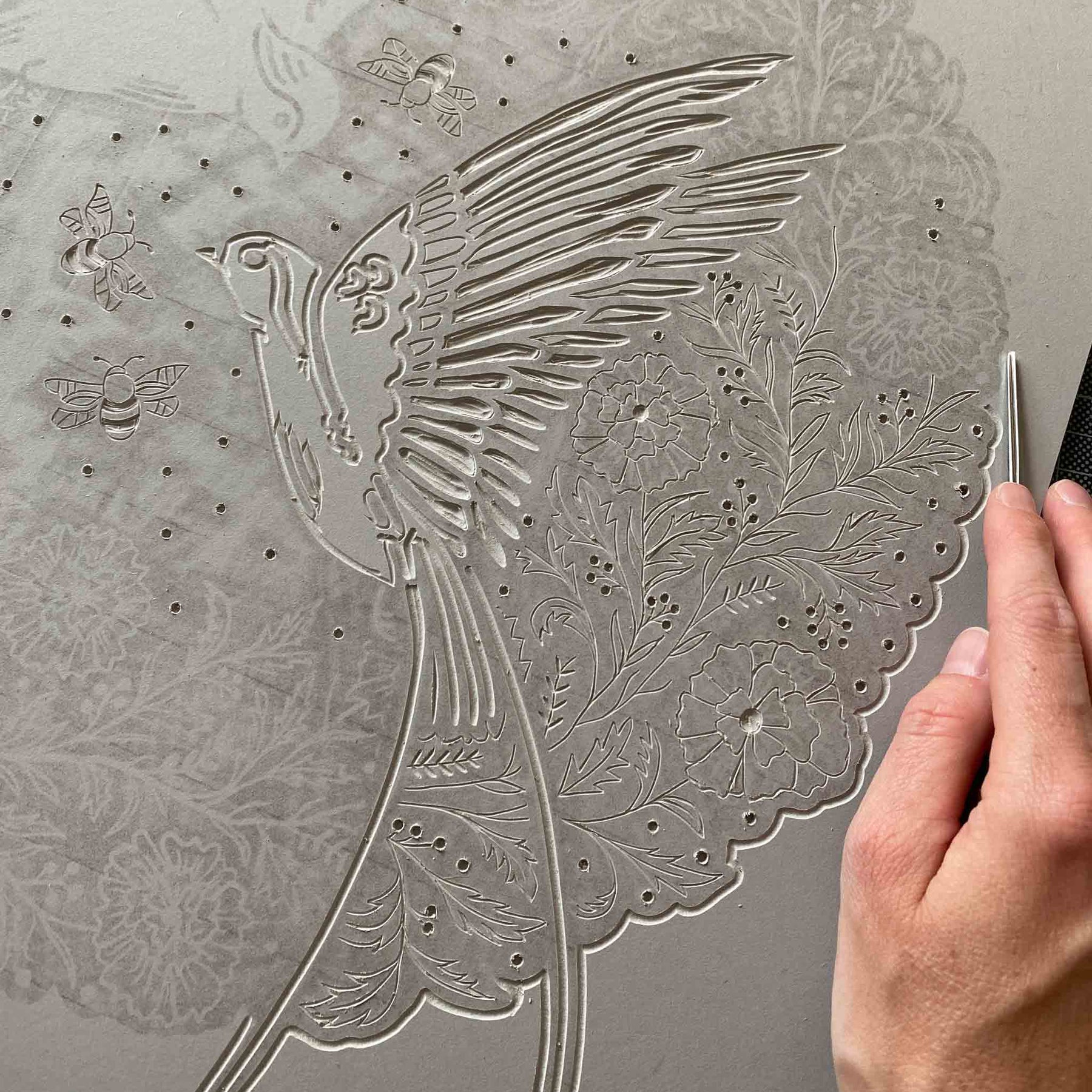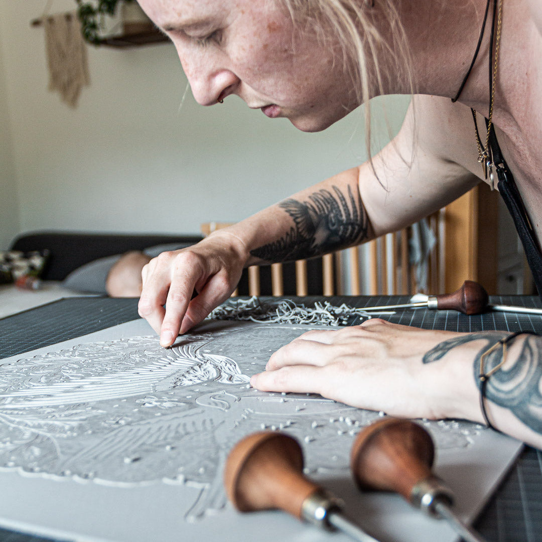 Der Linolschnitt ist ein traditionelles Hochdruckverfahren, bei dem das Motiv spiegelverkehrt in eine Linolplatte geschnitzt wird. Die erhabenen Flächen werden eingefärbt und mit einer Druckpresse auf das Medium übertragen.