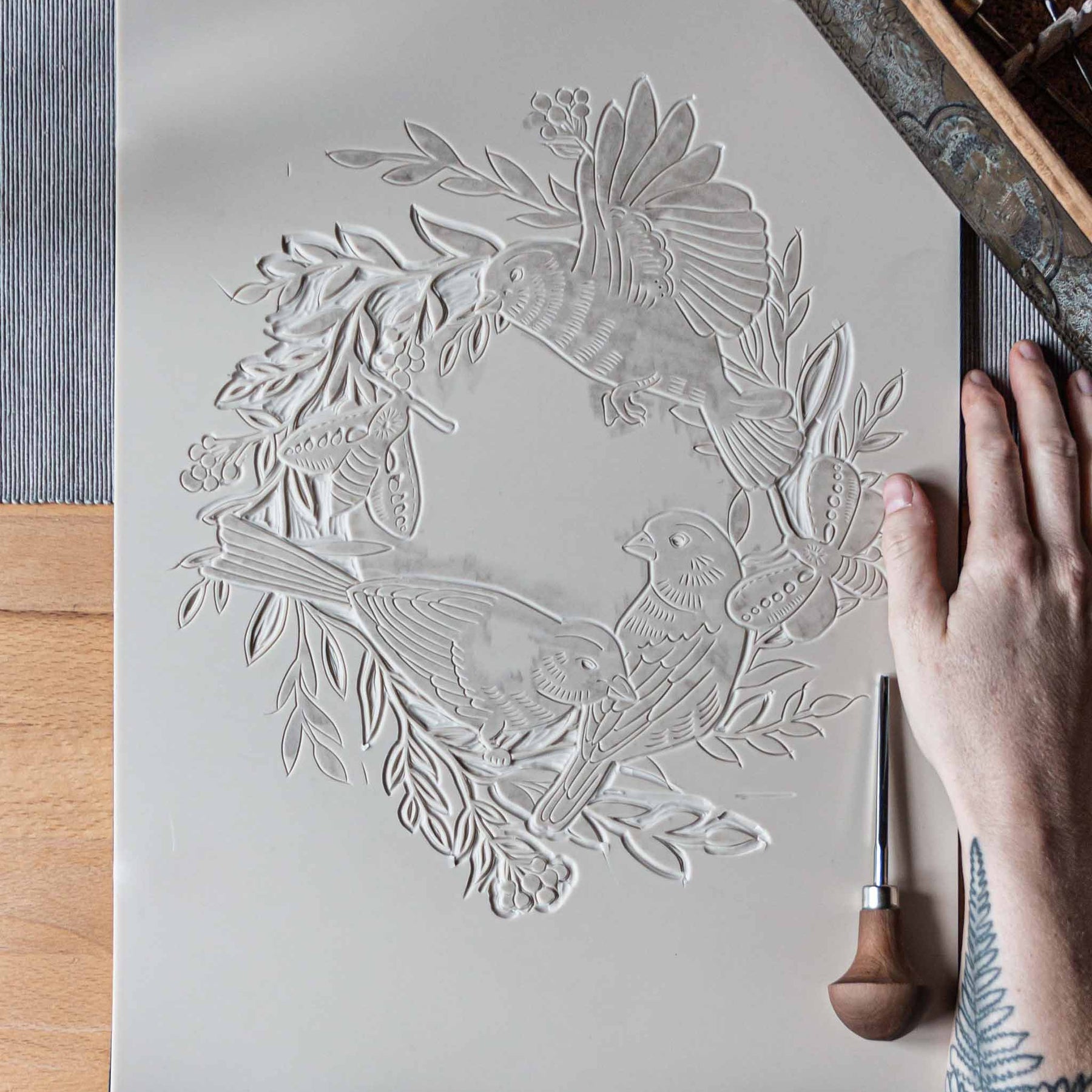 Vögel inmitten eines floralen Kranzes aus Blättern und Beeren – ein Motiv, das mir immer wieder begegnet. ☺️ Die Inspiration stammt aus dem Beobachten der Vögel in den blühenden Apfelbäumen unseres Gartens im Frühling. Für mich immer wieder ein Moment der Freude! 🫶🏼