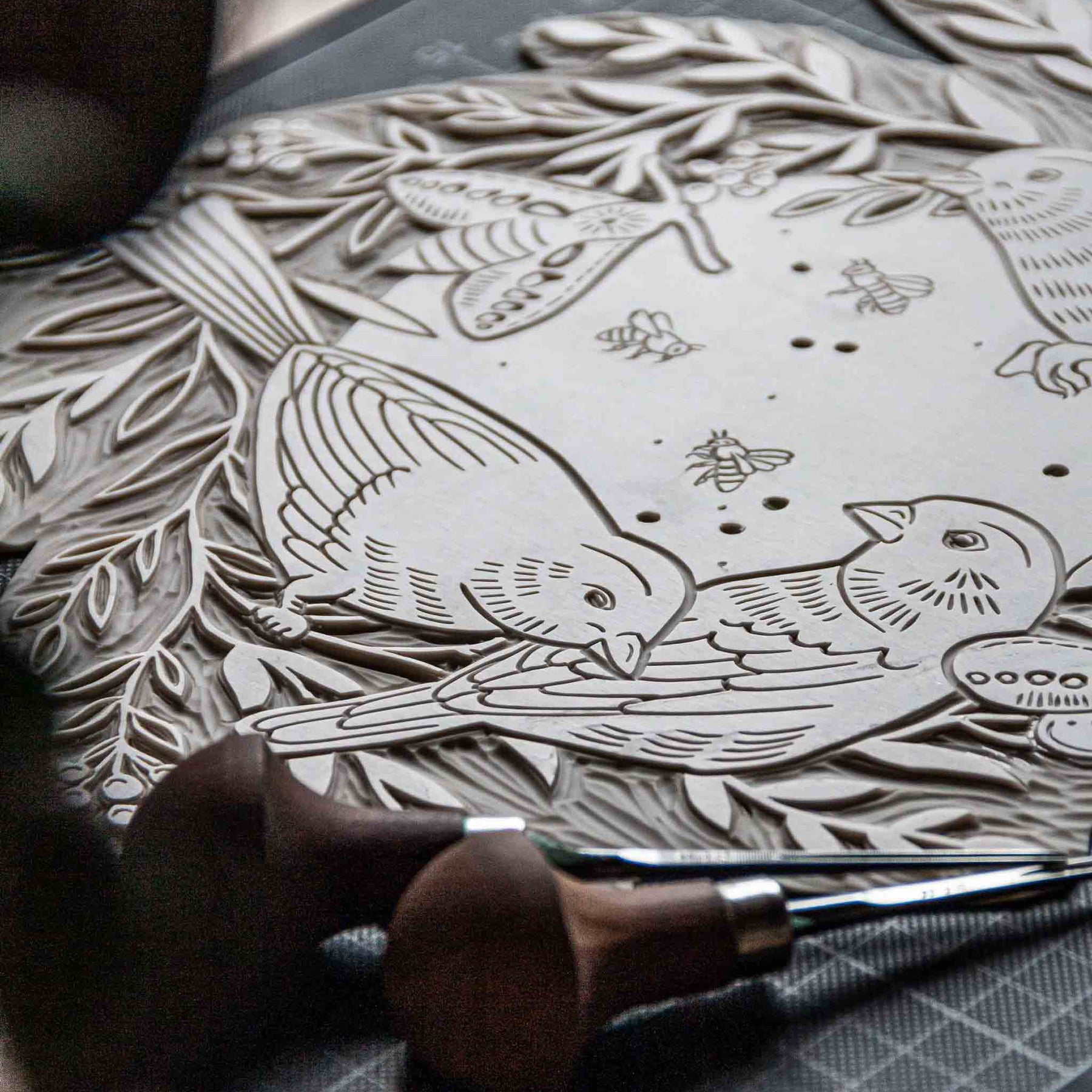 Der Linolschnitt ist ein traditionelles Hochdruckverfahren, bei dem das Motiv spiegelverkehrt in eine Linolplatte geschnitzt wird. Die erhabenen Flächen werden eingefärbt und mit einer Druckpresse auf das Medium übertragen.
