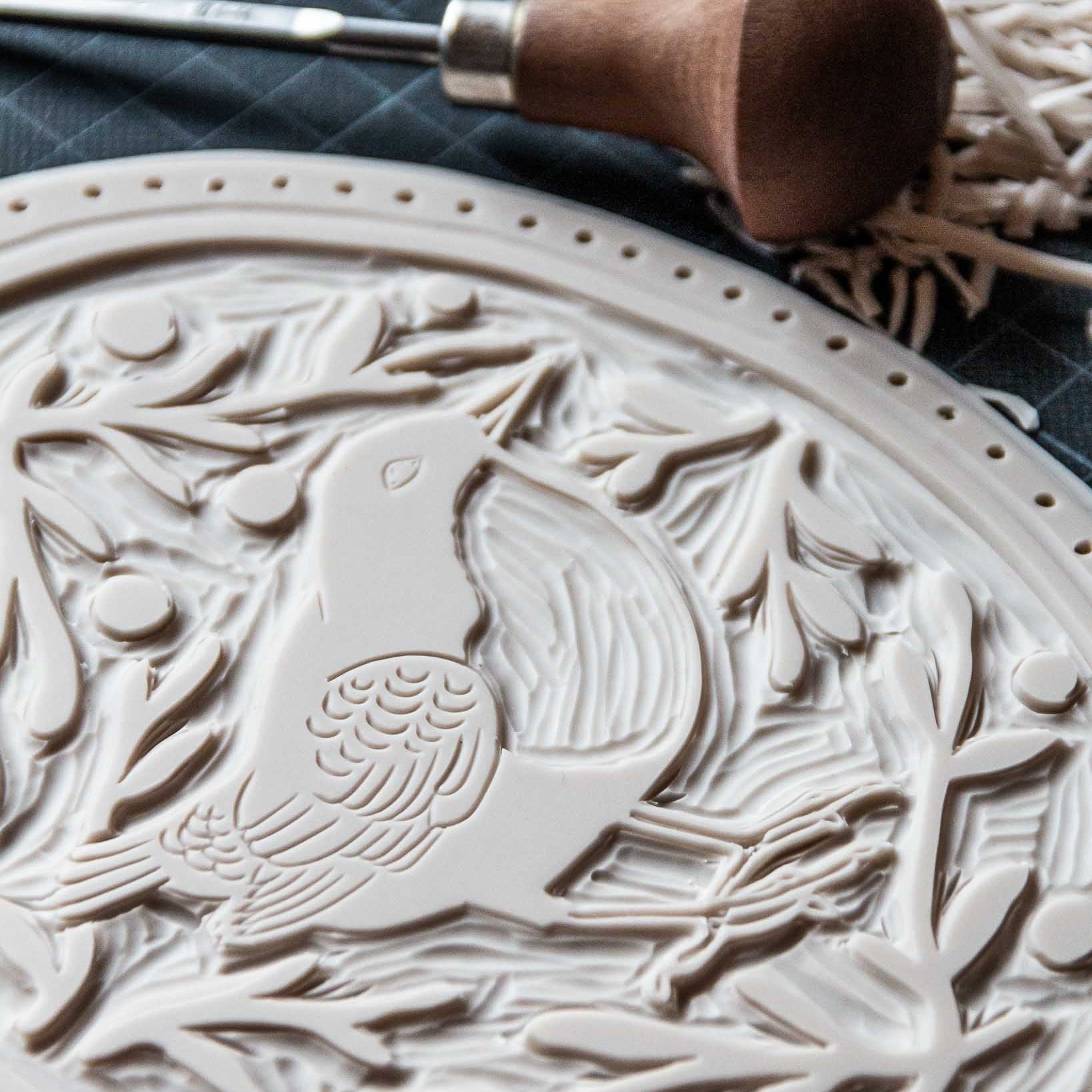 Der Linolschnitt ist ein traditionelles Hochdruckverfahren, bei dem das Motiv spiegelverkehrt in eine Linolplatte geschnitzt wird. Die erhabenen Flächen werden eingefärbt und mit einer Druckpresse auf das Medium übertragen.